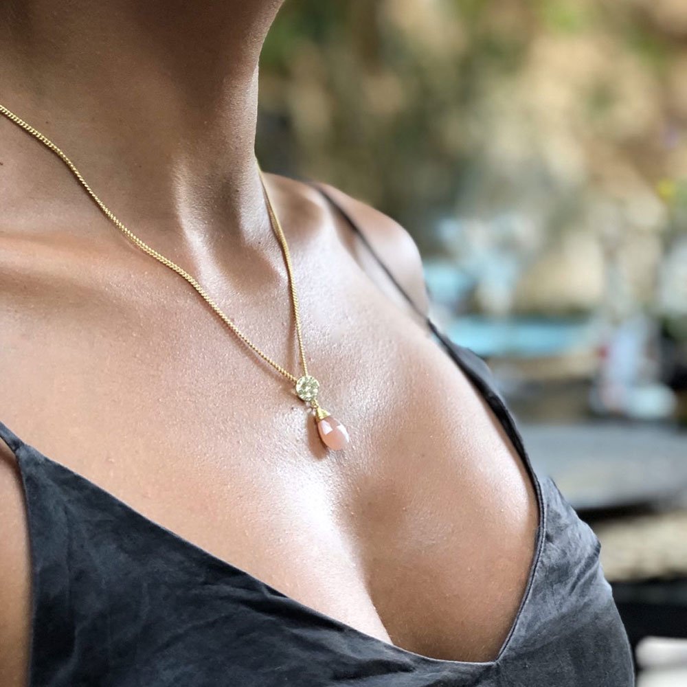 This striking 22k gold plated necklace is the perfect match to the earrings hand chosen and worn by Catherine, the Princess of Wales. Featuring a Briolette Gemstone pendant and luxuriously hand textured disc, delicately suspended from a gemstone laden chain, this is the perfect Azuni treasure for any modern day Goddess!